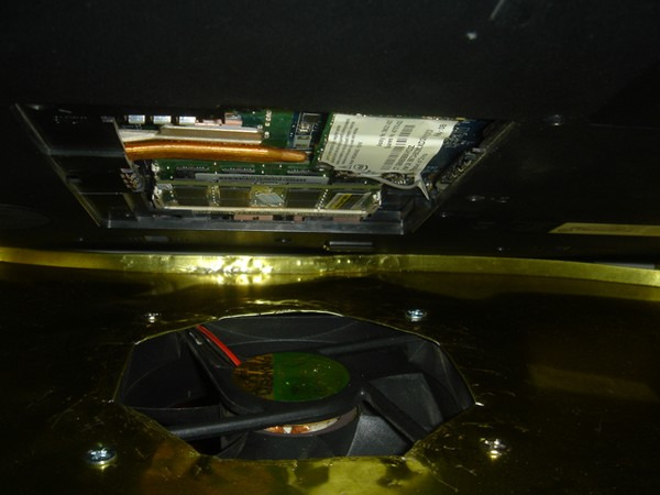放上筆記本可以看到,風(fēng)扇正對打開底板后的主板,北橋熱管清晰可見。