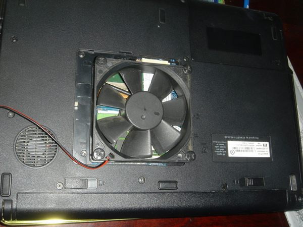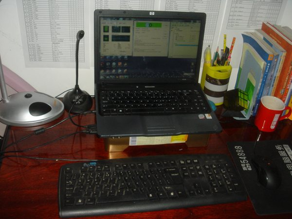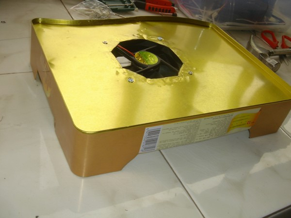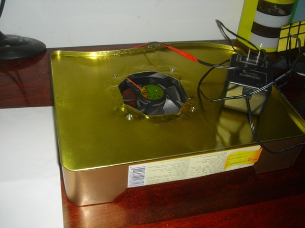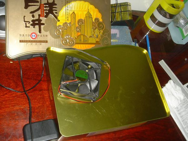 本人的筆記本為古老的HP520,散熱奇差。不過底部的內(nèi)存北橋無線網(wǎng)卡的模塊的蓋子可以輕松打開,正好可以被一個9CM風(fēng)扇覆蓋。于是打算以月餅盒為底座,在特定位置開一個孔安裝風(fēng)扇使筆記本放上后風(fēng)扇正對去掉那塊底板的筆記本主板。Sunon散熱風(fēng)扇