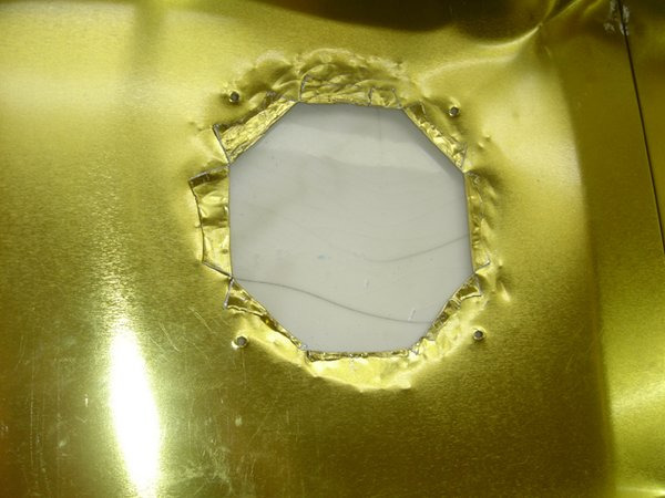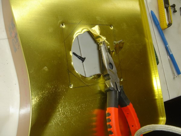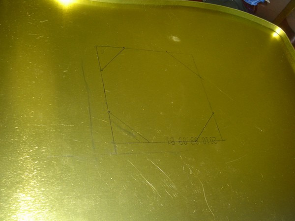 轉(zhuǎn)過頭來,繼續(xù)猥瑣的擴孔。擴到差不多的時候停止,上鋸條。這個地方我靈光一現(xiàn),覺著不用鋸一個八邊形出來——我只需要鋸出對角線的一部分,然后把剩余的材料翻折到背面,這樣既省力有不傷手。