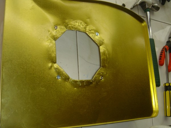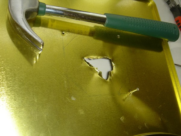 這個時候我想到,如果把正八邊形切除好了再打孔,恐怕強度已經(jīng)不夠了。于是操起錘子和釘子,確定位置關(guān)系后,打好四個定位孔(之后用螺絲固定風(fēng)扇)。
