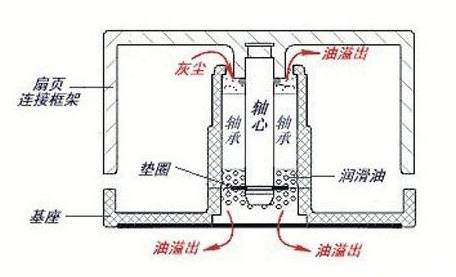 但是缺點太大:壽命短,工作一段時間后隨著油的揮發(fā)流失以及灰塵侵入會導(dǎo)致噪音增加速度減慢,更嚴重會軸心受損偏移發(fā)生震動,最后完全沒法用了。有些電腦風(fēng)扇停轉(zhuǎn)的問題就是由于用了這種風(fēng)扇。