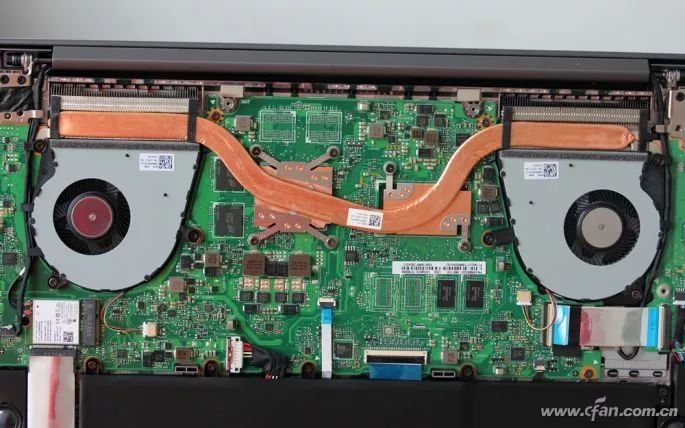 在筆記本的散熱模塊中,風(fēng)扇可以充當(dāng)“萬能調(diào)和劑”的角色。熱管又細又長還彎?鰭片面積不夠大?這些問題都可以通過風(fēng)扇進行“調(diào)和”。比如,同時安裝2個風(fēng)扇,那就意味著散熱鰭片的面積×2,風(fēng)量×2。