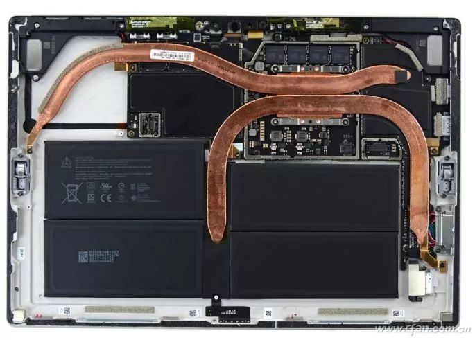 從New Surface Pro的拆機圖分析,這款產(chǎn)品為處理器準(zhǔn)備了2根又長又粗的熱管,其中1根為波浪型,另外1根為U型,它們將CPU產(chǎn)生的熱量散布到更大的面積上,讓整個金屬材質(zhì)的后蓋都充當(dāng)了“散熱鰭片”的角色。