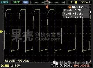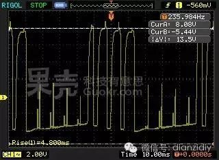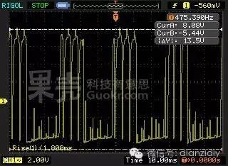 回到實(shí)驗(yàn)室,看滿(mǎn)載下的示波器能看見(jiàn)的轉(zhuǎn)速信號(hào)輸出脈沖。