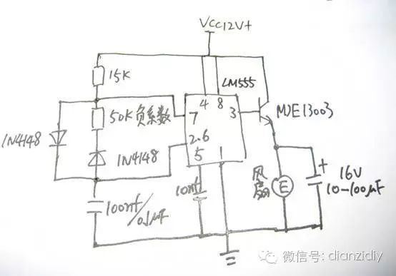 基礎(chǔ)電路就是一個(gè)LM555無(wú)穩(wěn)態(tài)多諧振蕩器,用兩個(gè)二極管控制電容C1 100NF的充放電回路,電路的占空比可以從0~100自動(dòng)的根據(jù)溫度可調(diào),具體值為R3(50K)/R1(15K)。整體電路的工作頻率是T=C1*(R1+R3)*ln2。用MJE13003擴(kuò)流。
