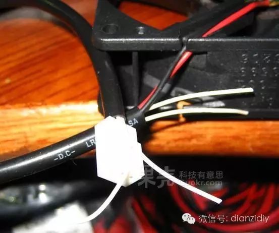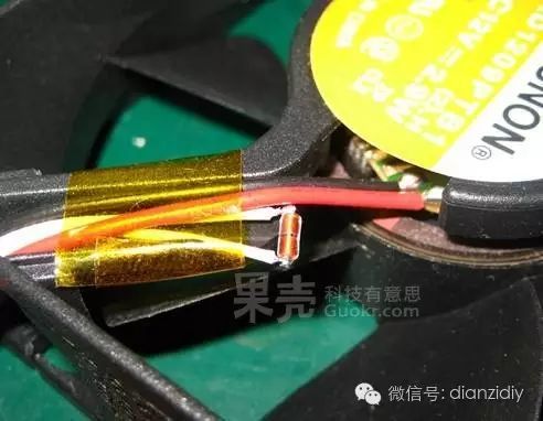 在這里,熱敏電阻選擇安裝在風(fēng)扇的出風(fēng)口,用耐高溫膠帶捆扎固定在電源線(xiàn)的線(xiàn)槽內(nèi),這樣可以感應(yīng)到氣流的溫度,控制風(fēng)扇的轉(zhuǎn)速。
