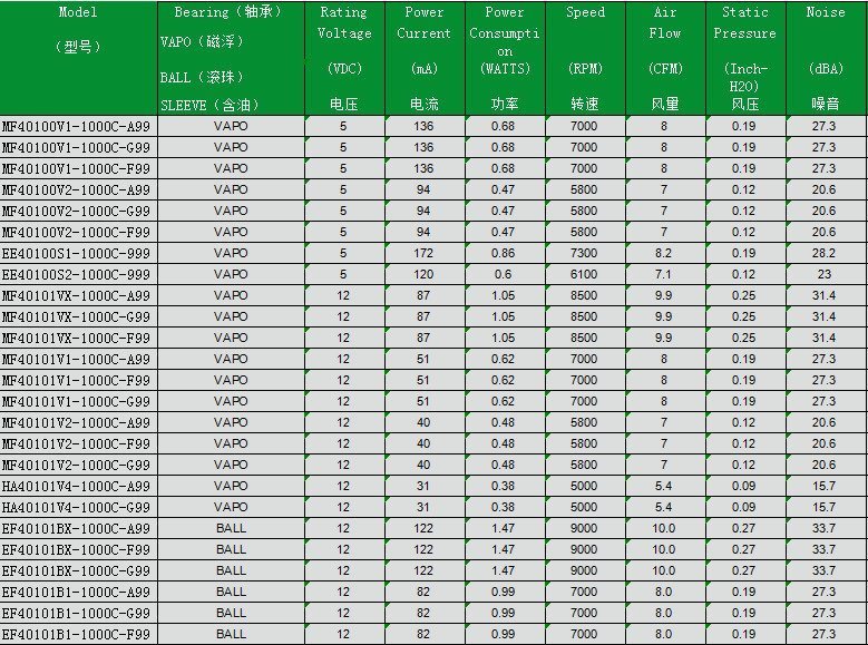 Size (mm) Air Flow (CFM) Size (mm) Air Flow (CFM) 50x50x15 2.6 ~ 5.4 97x94x33 22.4 ~ 30.5 50x50x20 4.8 ~ 5.7 97x95x33 44.2 ~ 54.7 60x60x15 3.9 ~ 5.7