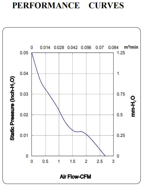 Size (mm) Air Flow (CFM) Size (mm) Air Flow (CFM) 17x17x8 0.7 ~ 0.9 60x60x15 10.8 ~ 21.0 20x20x8 1.3 ~ 1.6 60x60x20 16.0 ~ 30.5 20x20x10 1.5 ~ 1.9