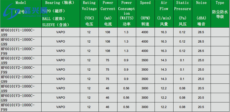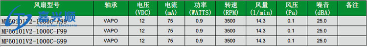 MF60101V2-1000C-F99是60*60*10mm散熱風扇,是建準自主研發(fā)的產(chǎn)品DR MagLev (Dust-Resistance MagLev )防阻微塵磁浮馬達風扇。該MagLev新科技框架式結(jié)構(gòu),可防止馬達定子、扇葉移位脫落,具有阻隔微塵效果、更高信賴性和更長壽命;適用于汽車電子、船舶、無人機、光電、軍工、網(wǎng)通等產(chǎn)業(yè)客戶的散熱設計;是各科技企業(yè)率、大批量生產(chǎn)加工的理想選擇。MF60101V2-1000C-F99具有低噪音,長壽命的特點。