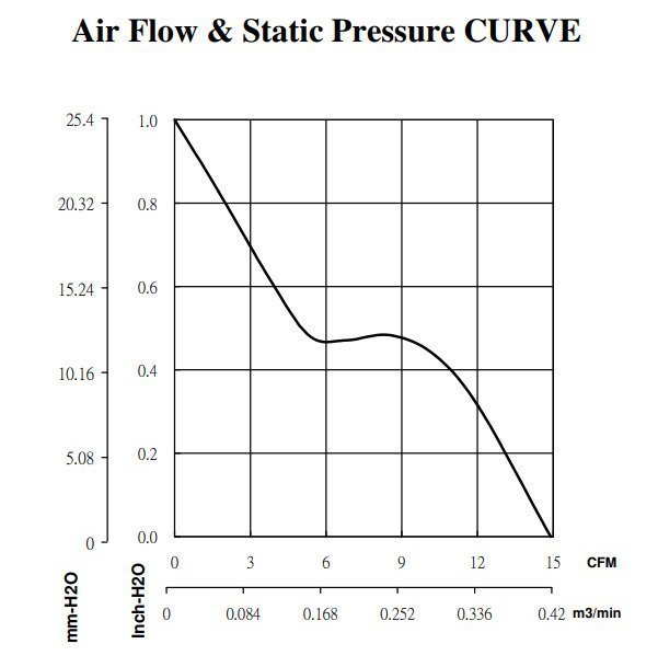 Size (mm) Air Flow (CFM) Size (mm) Air Flow (CFM) 17x17x8 0.7 ~ 0.9 60x60x15 10.8 ~ 21.0 20x20x8 1.3 ~ 1.6 60x60x20 16.0 ~ 30.5 20x20x10 1.5 ~ 1.9